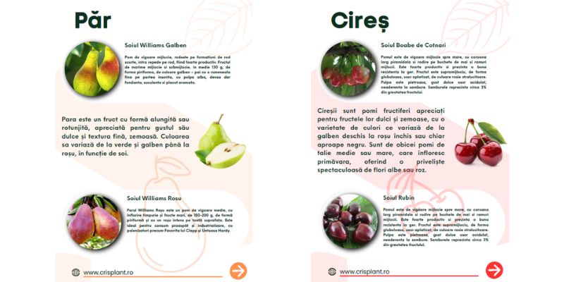 • Pomi fructiferi – mere (Gala Imperial, Starkrimson, Granny Smith, Topaz, Jonathan, Idared, Mutsu, Florina etc.), peri (Williams Galben și Roșu, Abate Fetel, Untoasa Hardy, Santa Maria, Kieffer, Packham’s Triumph), cireși (Stella, Regina, Carmen, Kordia, Rubin, Van, Timpurii de Bistrița), vișini (Meteor, Crișana, Timpuriu de Cluj), pruni (Stanley, Record, Bistrițan, Goldania, Tophit, Angeleno, d’Agen), gutui, caise (Uriasa de Cegled, Mamaia, Sulmona, Orange Red, NJA), piersici (Champion, Red Haven, Royal Summer, Baby Gold, Paraguay Plat, Superba de Toamnă, Cardinal, UFO Plat), nectarine (Nectared 2, Venus, Flavortop, Caldesi Timpuriu, Plat), dar și specii mai exotice (kaki Jiro, smochin, moșmon).