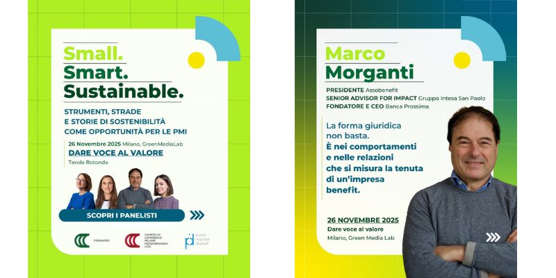 Pe 26 noiembrie 2025 vom fi prezenți la Green Media Lab, Milano, la evenimentul „Small. Smart. Sustainable. – Dare voce al valore”, o inițiativă dedicată întreprinderilor mici și mijlocii (PMI) care doresc să transforme sustenibilitatea într-un avantaj competitiv și o poveste autentică de valoare.